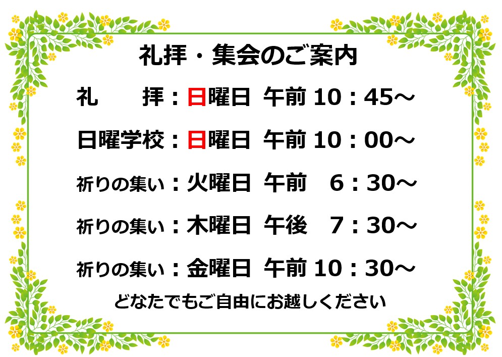 | 祈りの集い | 金曜 10:30~11:30 | 礼拝とはひと味違った集まりです。 いきなり礼拝はちょっと・・・という方はぜひお越しください。 |